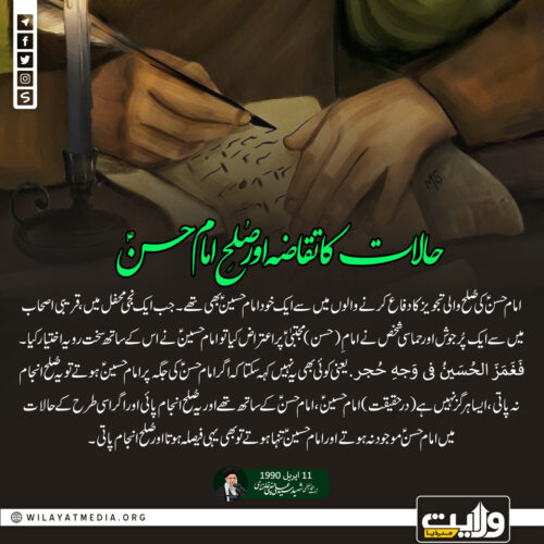 صُلحِ امام حسنؑ کے باب میں ہم نے کئی بار بات کی ہے اور (مصنفین نے) کتابوں میں لکھا ہےکہ اگر کوئی بھی ہوتا، اگر امام حسن مجتبیؑ کی جگہ پر خود امیر المومنین امام علیؑ بھی ہوتے اور ویسے ہی حالات سے دچار ہوتےتو ممکن ہی نہیں تھا کہ