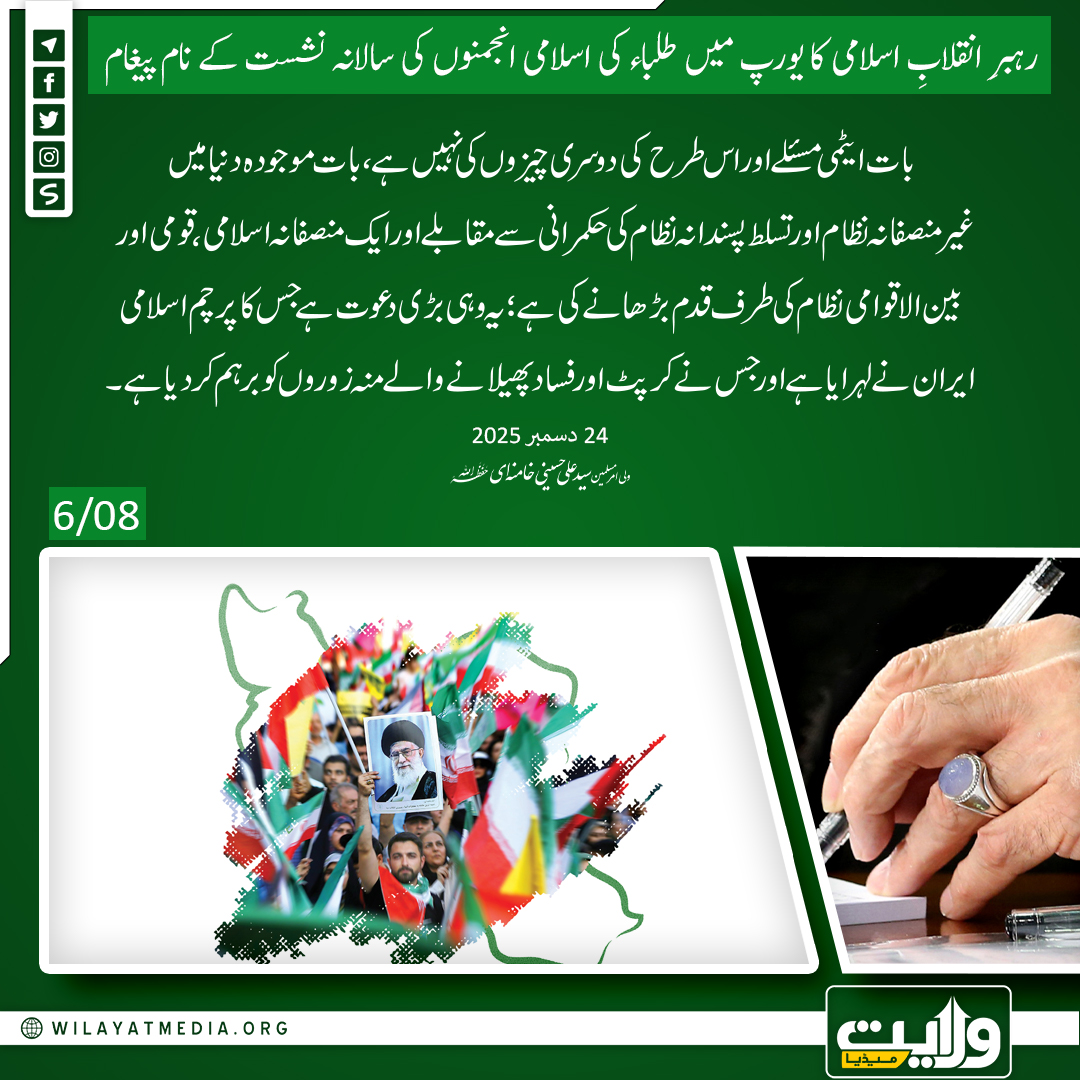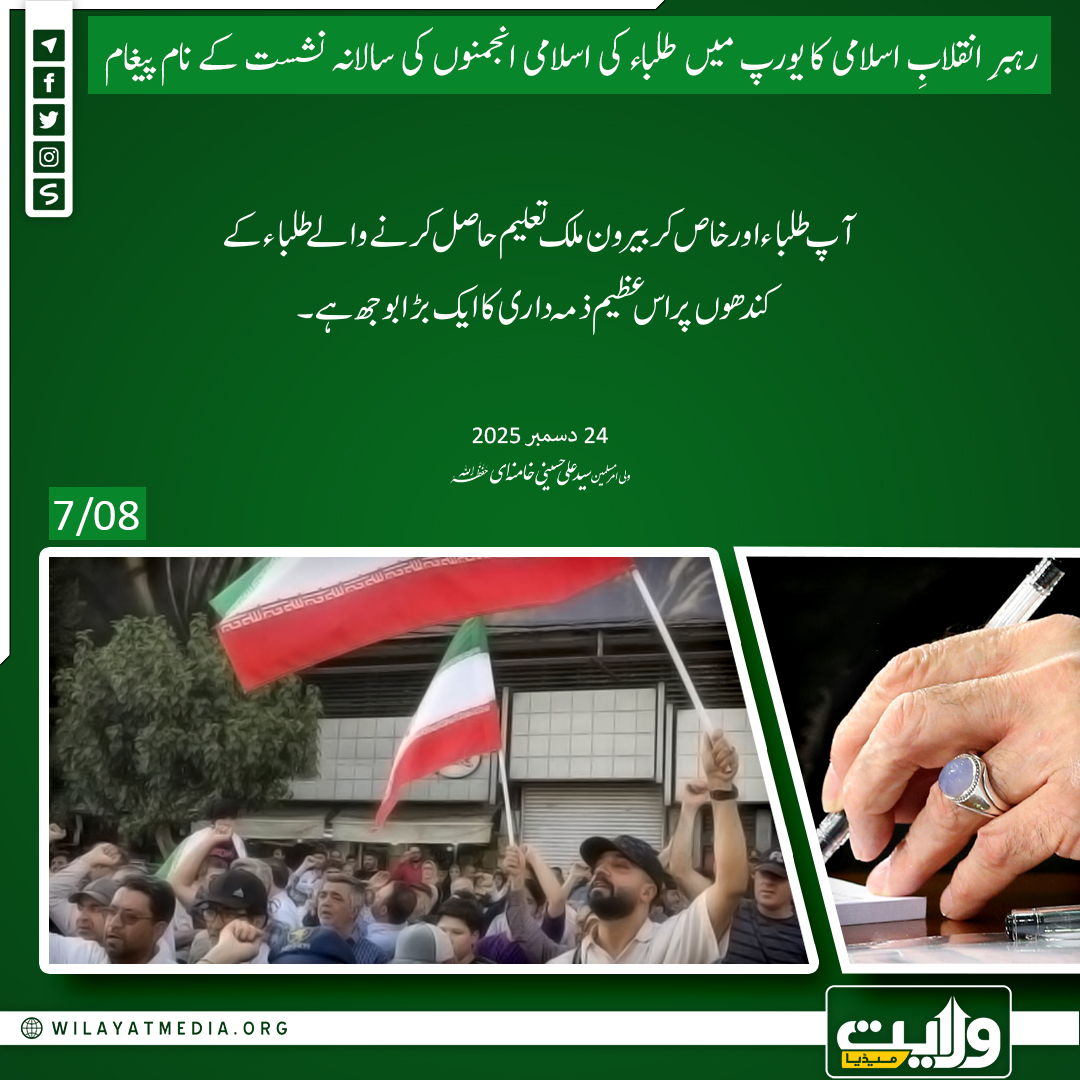 - رہبرِ انقلابِ اسلامی کا یورپ میں طلباء کی اسلامی انجمنوں کی سالانہ نشست کے نام پیغام کا تصویری مجموعہ